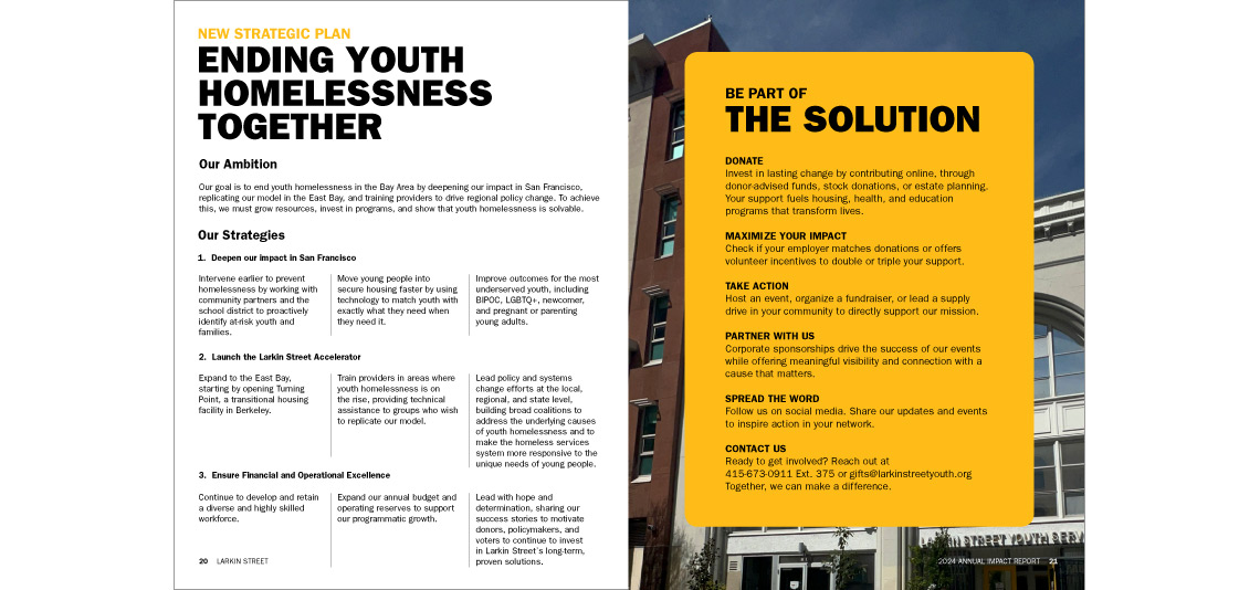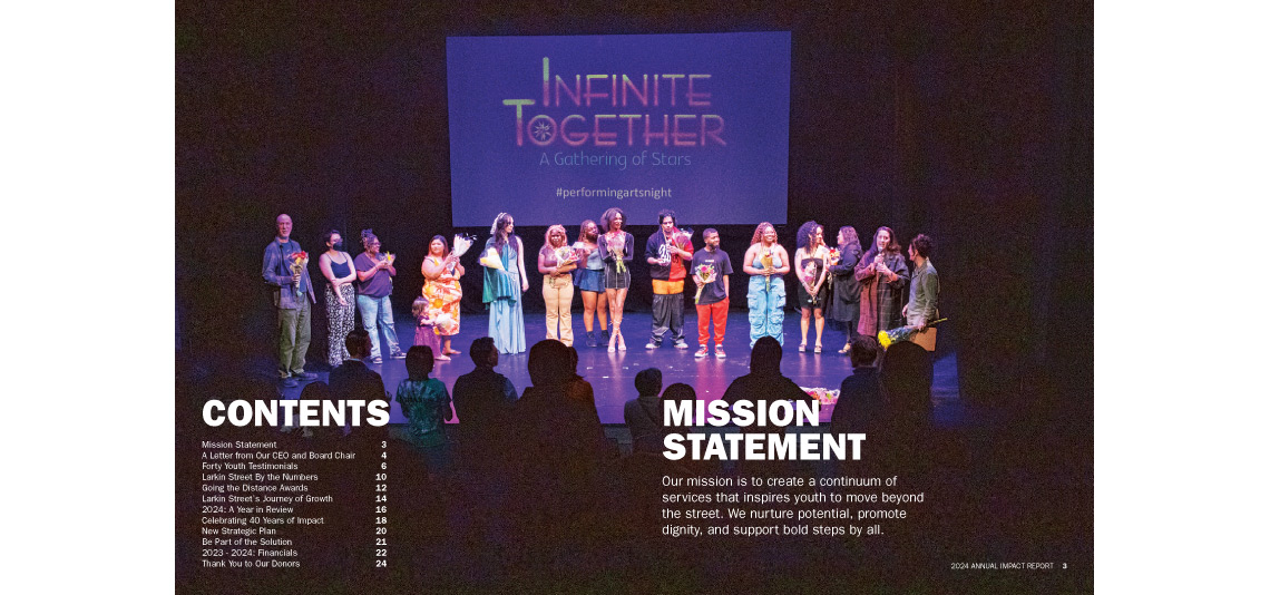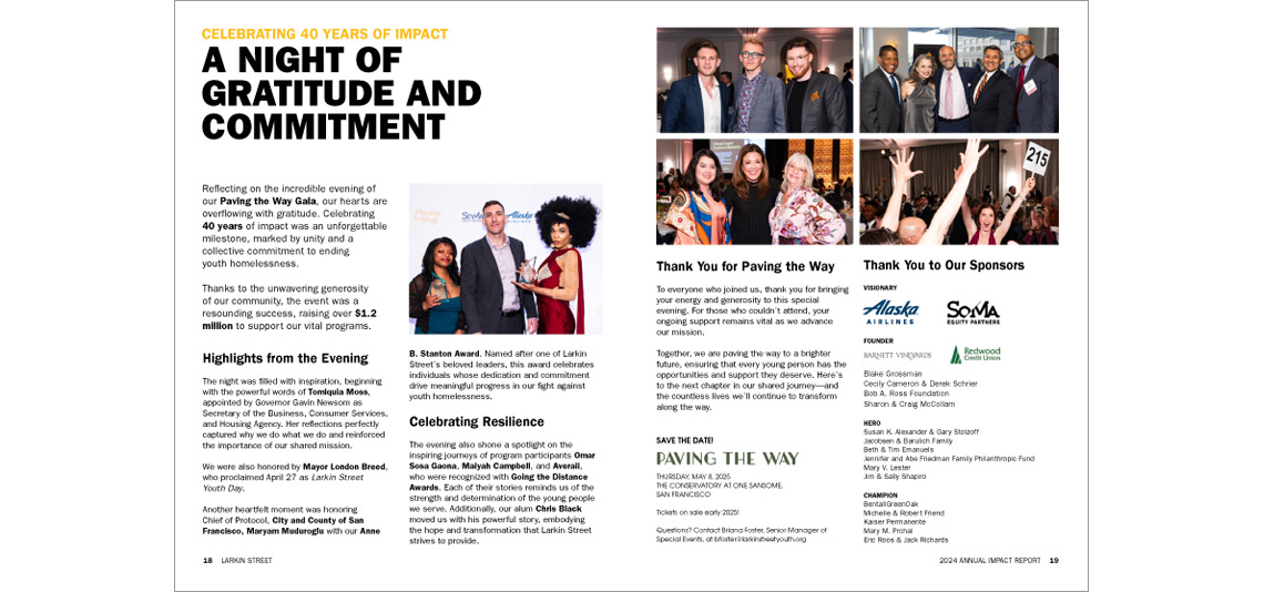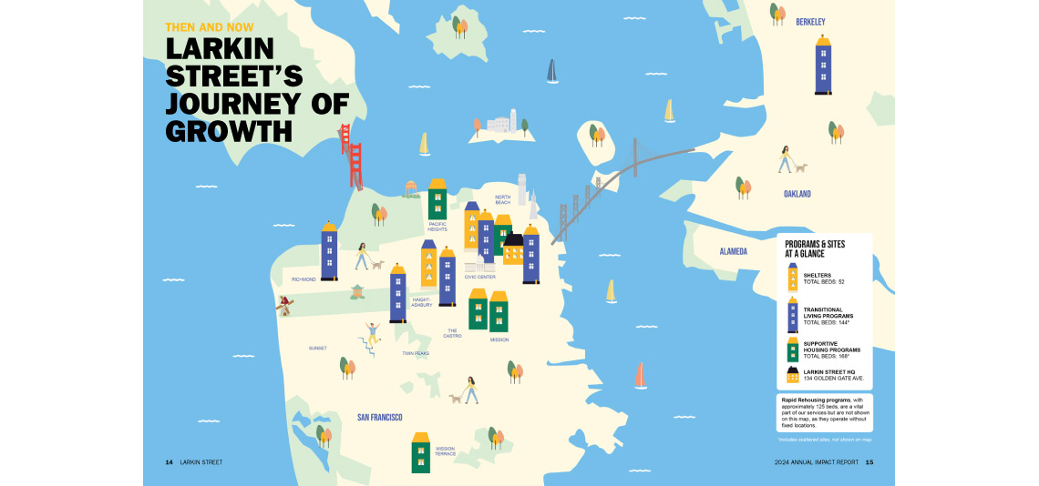 Larkin Street wanted a bold cover to celebrate the 40th anniversary of their Paving the Way fundraising event. They also wanted to highlight their many housing facilities throughout the city and the bay area. They had me create a fun, illustrated map to visually emphasize their housing expansions. Even though funding is down during these hard financial times, I'm still very proud to continue to work with Larkin and play a part in their goal to end youth homelessness in the city.