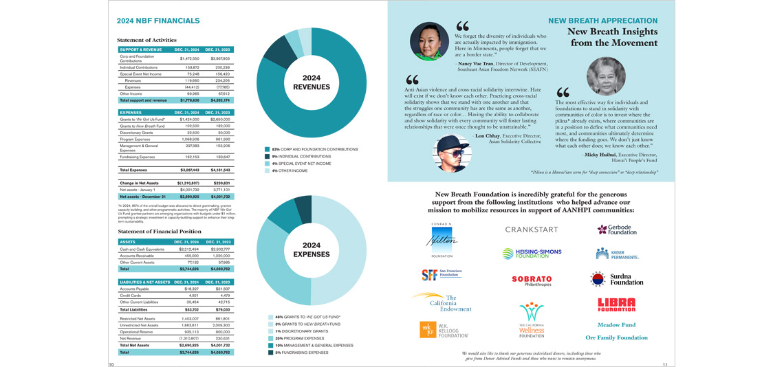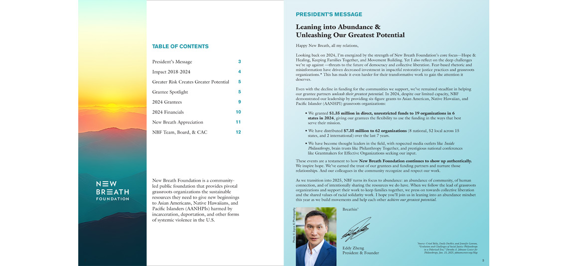 I was happy when New Breath Foundation asked me to design another annual report for them. And my client contact was happy when I told her my final hours and cost came to HALF of what I originally quoted (based on the previous year's report)! The previous report had been very text heavy and they were a new client, so I think it took me some time to work out the branding and get everything to work cohesively. And this year I wanted to make sure things looked cleaner and the pages felt less busy. I went with cleaner backgrounds and a simpler, more soothing overall look. And it helped that I wasn't reinventing the look and feel and could borrow elements from the previous report, to help with more consistent branding.