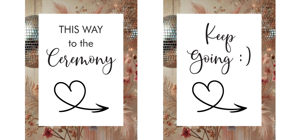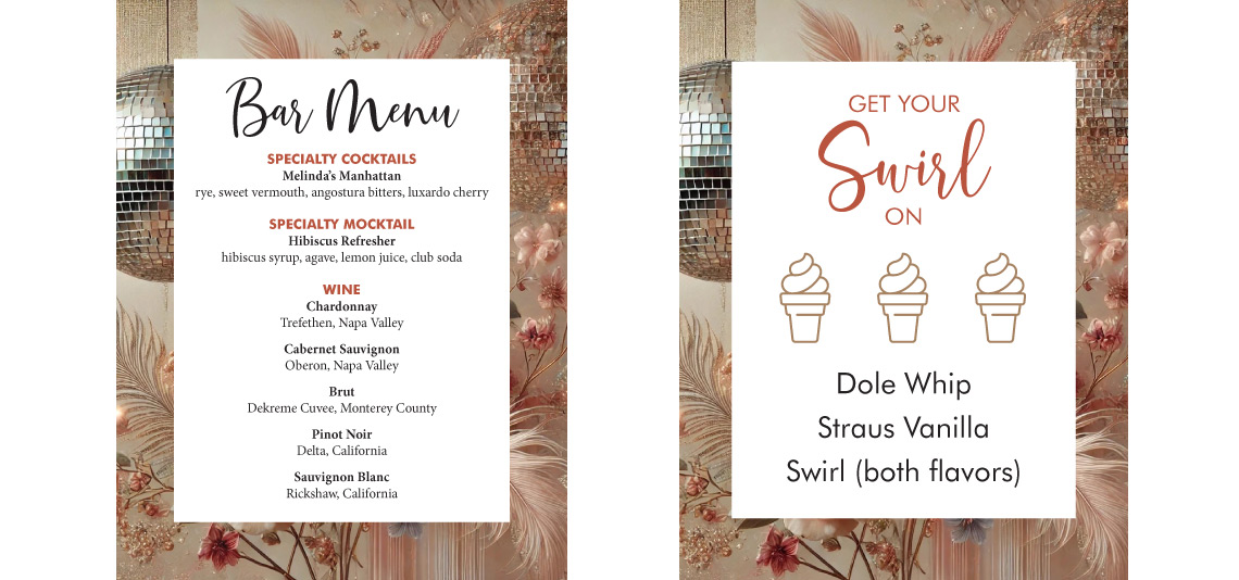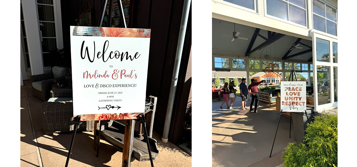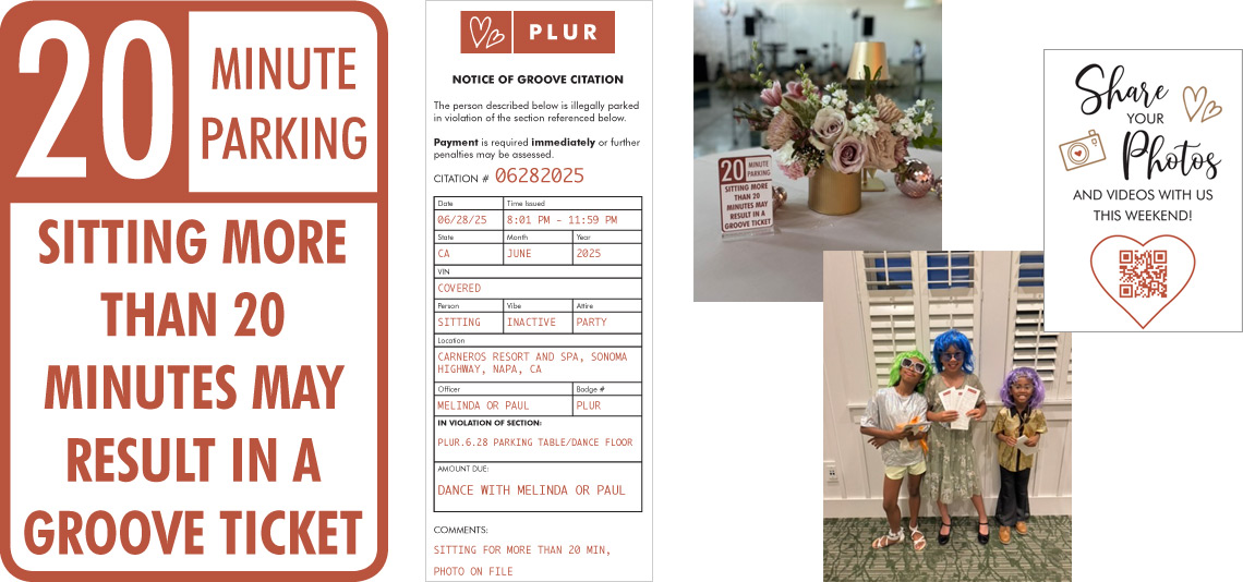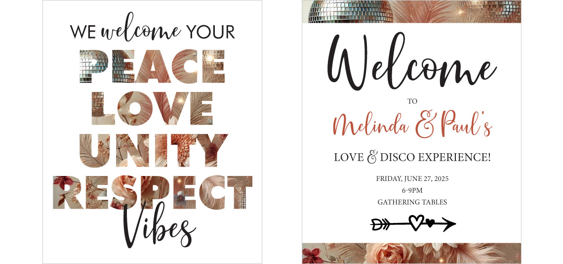 This was a DREAM project for me. I've always enjoyed working with this client. She had a wedding coordinator who was incredibly organized and creative. And the theme for the wedding was "Love & Disco"! At first when I agreed to work on the wedding signs, I thought it would be a few welcome signs for a hotel lobby and some directional signs for getting to different events. When we met on zoom I was a bit intimidated by how many pieces were actually needed, but I loved their enthusiasm and excitement. And they had a giant, detailed spreadsheet listing every project, size, text content and paper quality. (Oh, how I love an organized client!) The bride had created a beautiful AI image that included disco balls, flowers and feathers. It definitely set a strong tone for the event and sparked my imagination. In total I created 20 different print pieces, including large welcome signs, schedules, directional signs, menus and small sharing cards where guests received different questions with space to write on the back. There was even a "no parking" sign and a "groove citation" handed out encouraging people to get on the dance floor. I had so much fun with this project and was sad when it was all over.